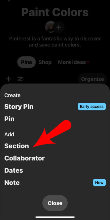 Here’s how to create a section for a Pinterest board using the Pinterest app: