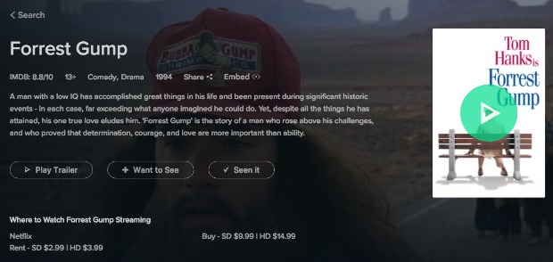 If a video is available for rental or purchase, Reelgood will show you that too. You can see where a video can be rented or purchased and how much the video will cost.